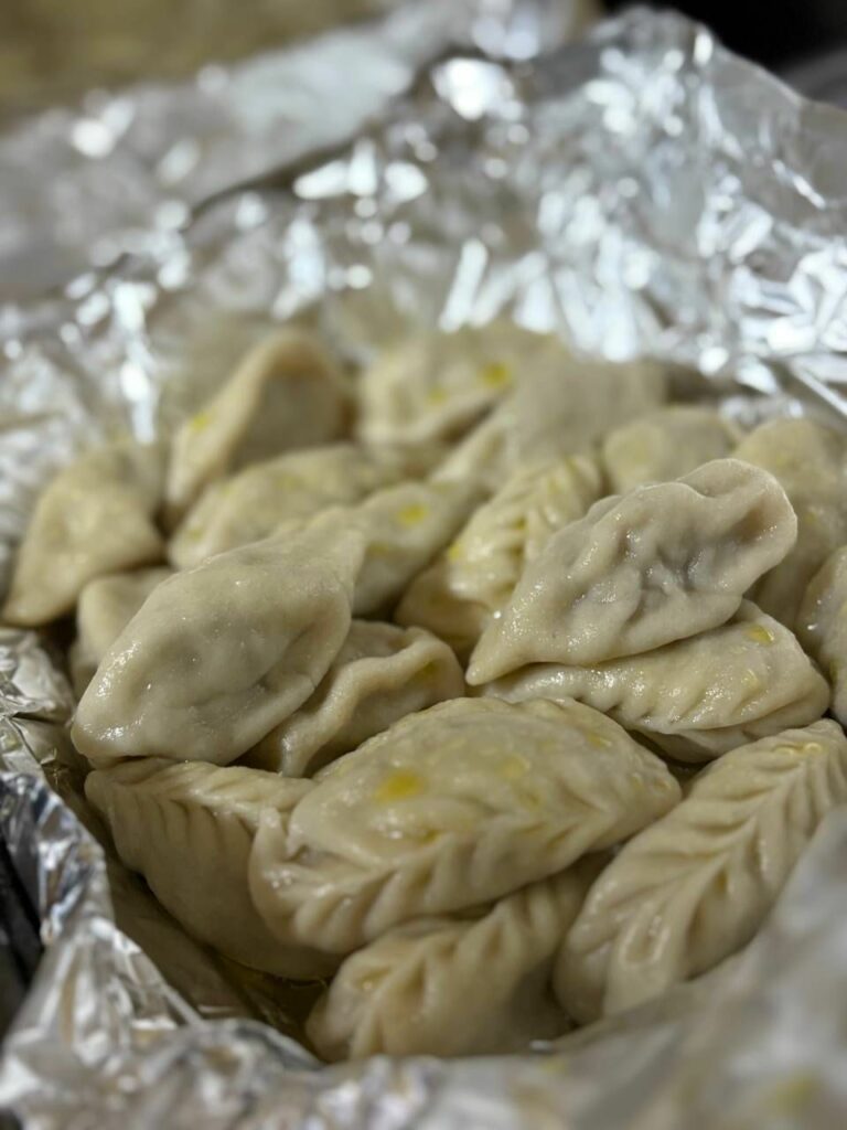 - Хинкал Даргинский с сушеной колбасой подается с бульоном и соусом